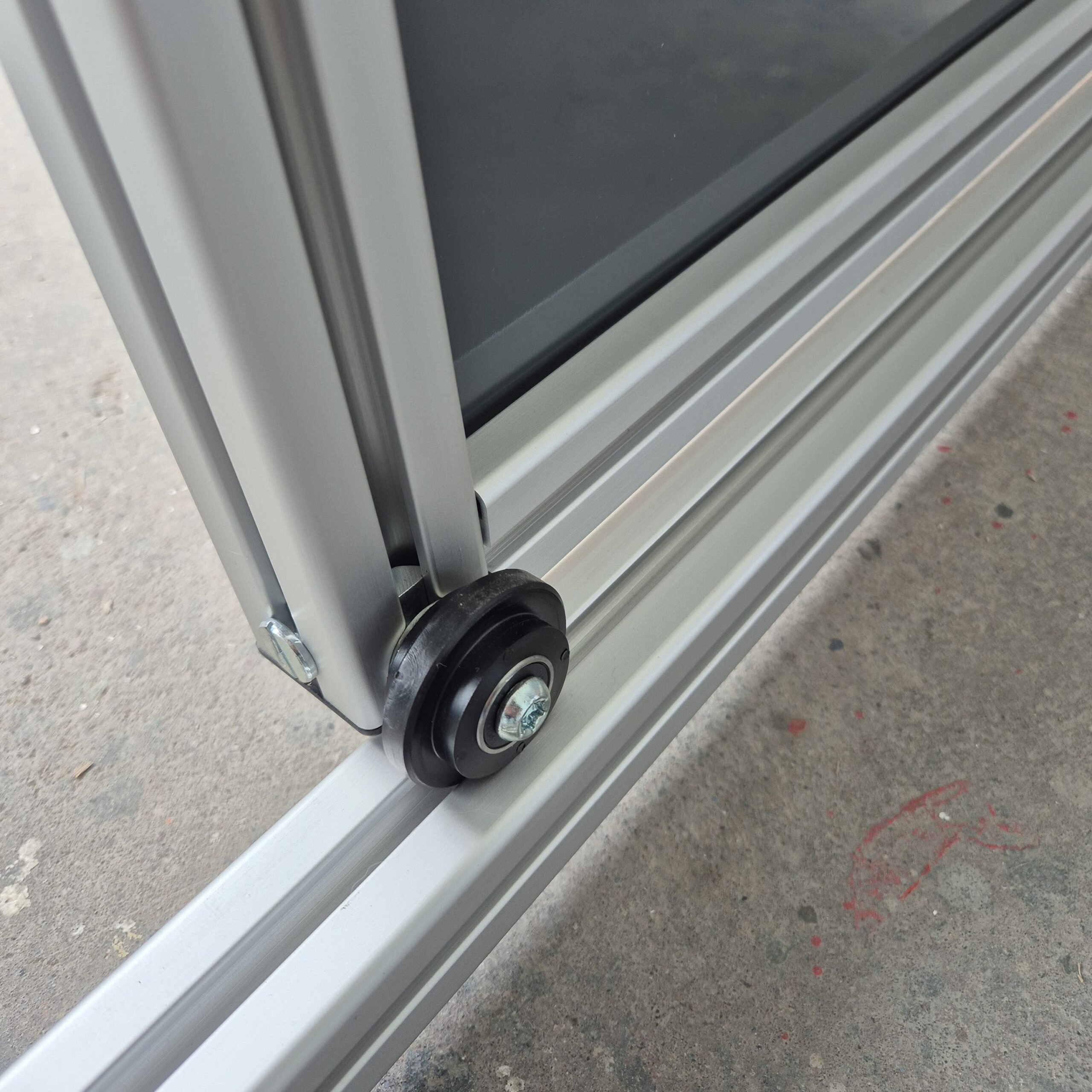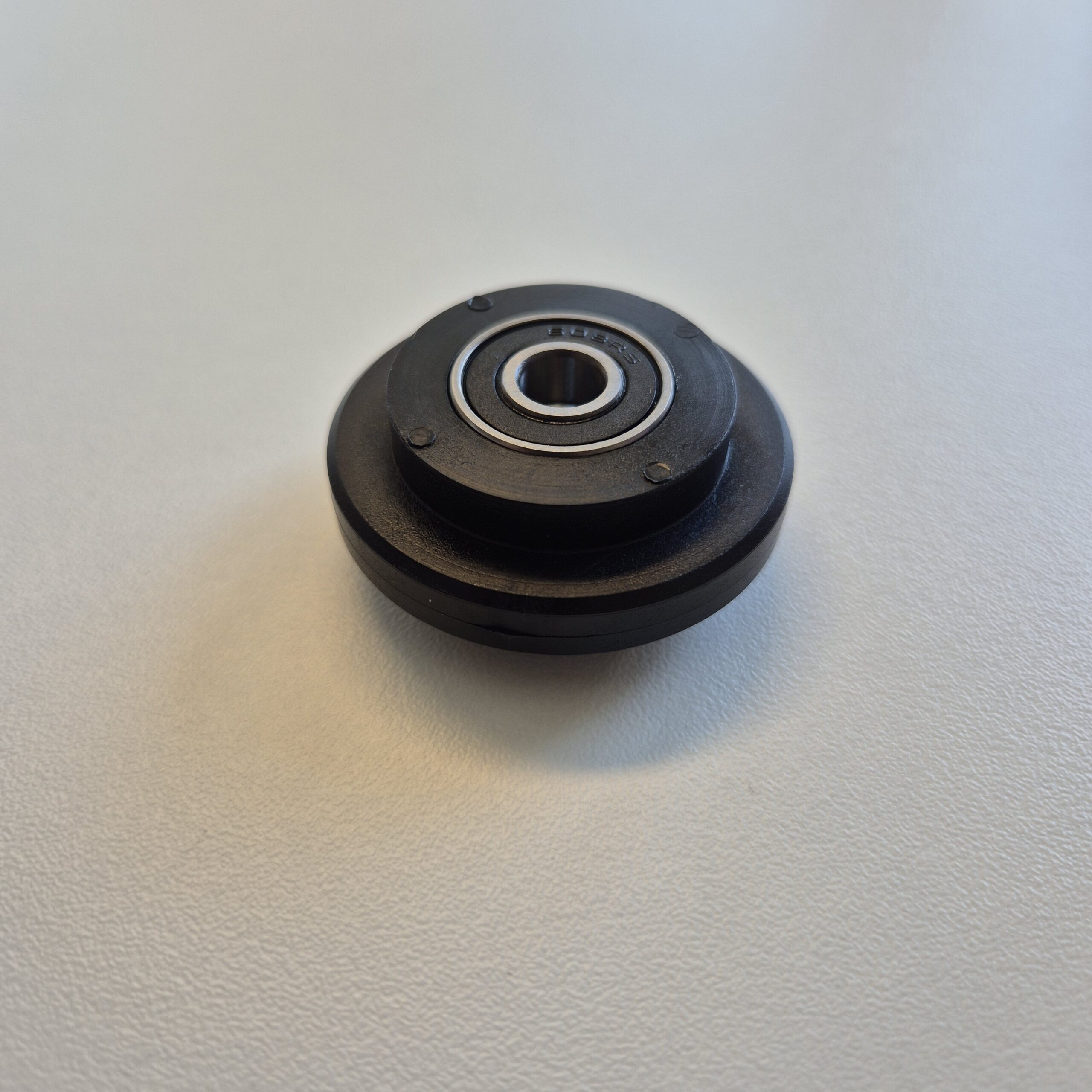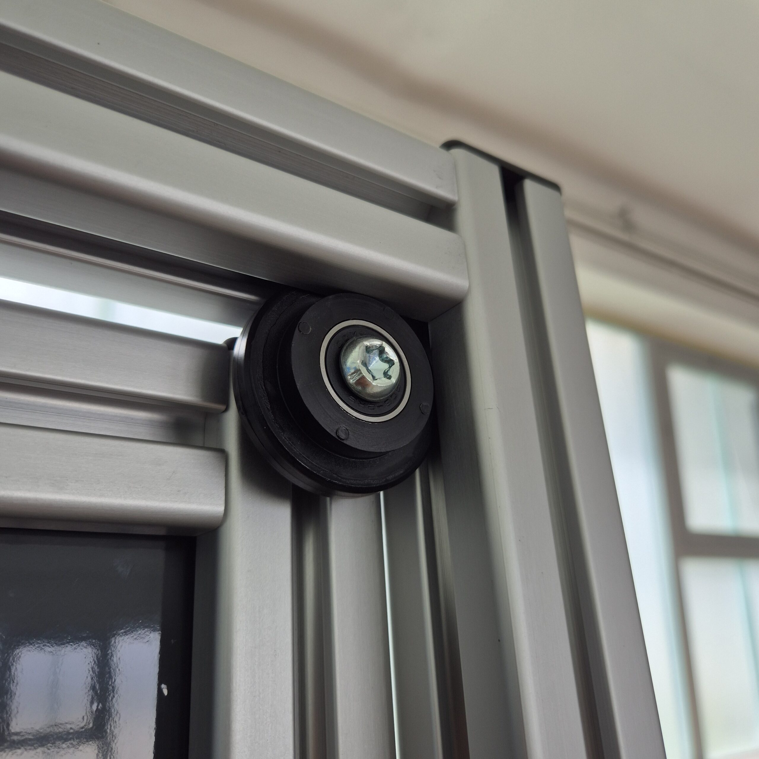 Die Nutrolle ist so konzipiert, dass sie in der Nut 8 mm des Profils läuft. Durch die beiden Kugellager mit der Bohrung von 8 mm lässt sie sich perfekt mit einer Schraube M8 im Profil verbauen. Die Gesamtbreite der Rolle beträgt 20 mm. Der Durchmesser der beiden Absätze beträgt 33,5 mm, der des mittigen großen Durchmesser 47 mm.