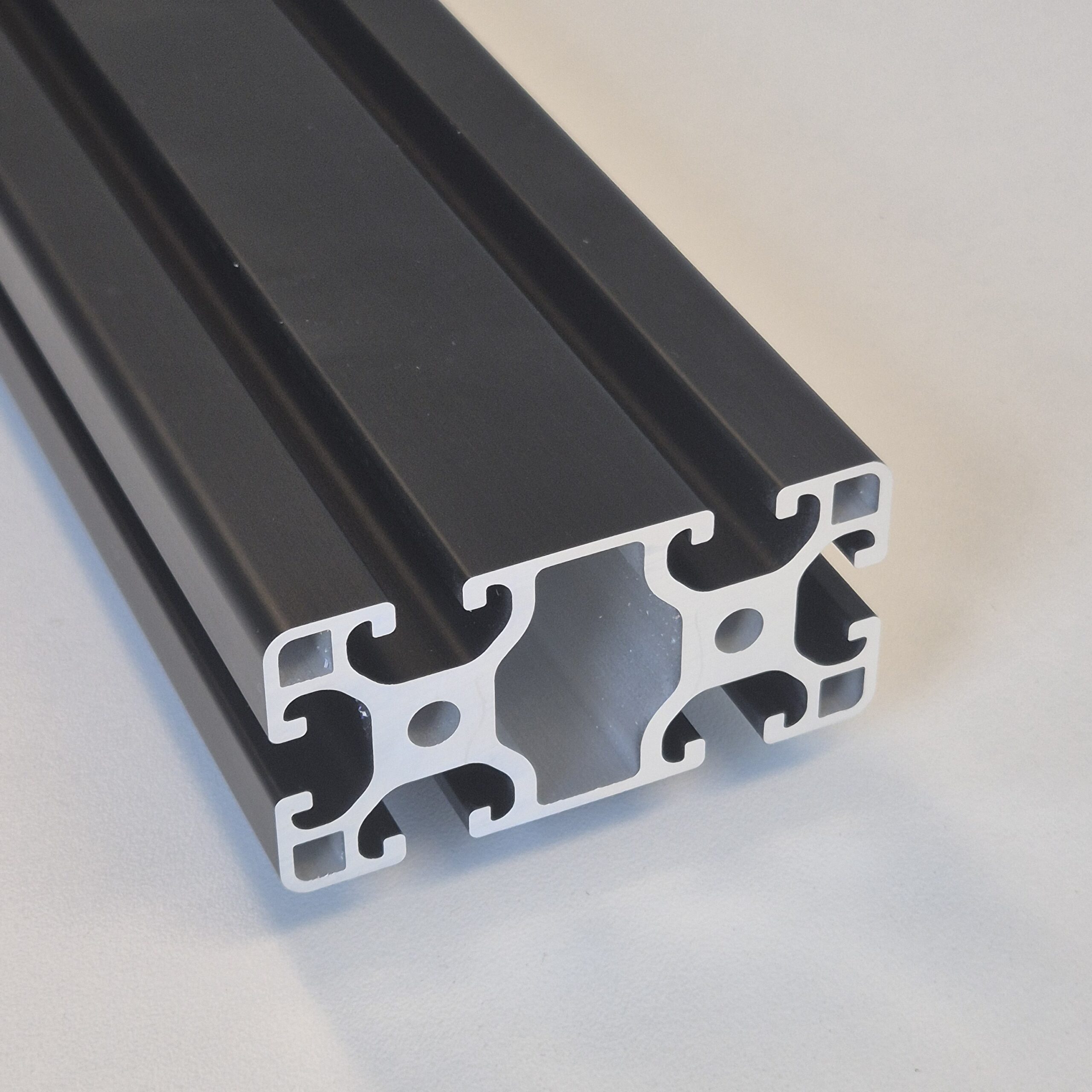 Unser Standardprofil als 80×40 mm und in schwarz. Quer zur langen Seite des Qerschnitts können wesentlich höhere Kräfte aufgenommen werden. Hier ist die Anbindung von Verbindungstechnik und Zubehör über alle vier Seiten des Profils möglich. Die Nutbreite beträgt 8 mm.