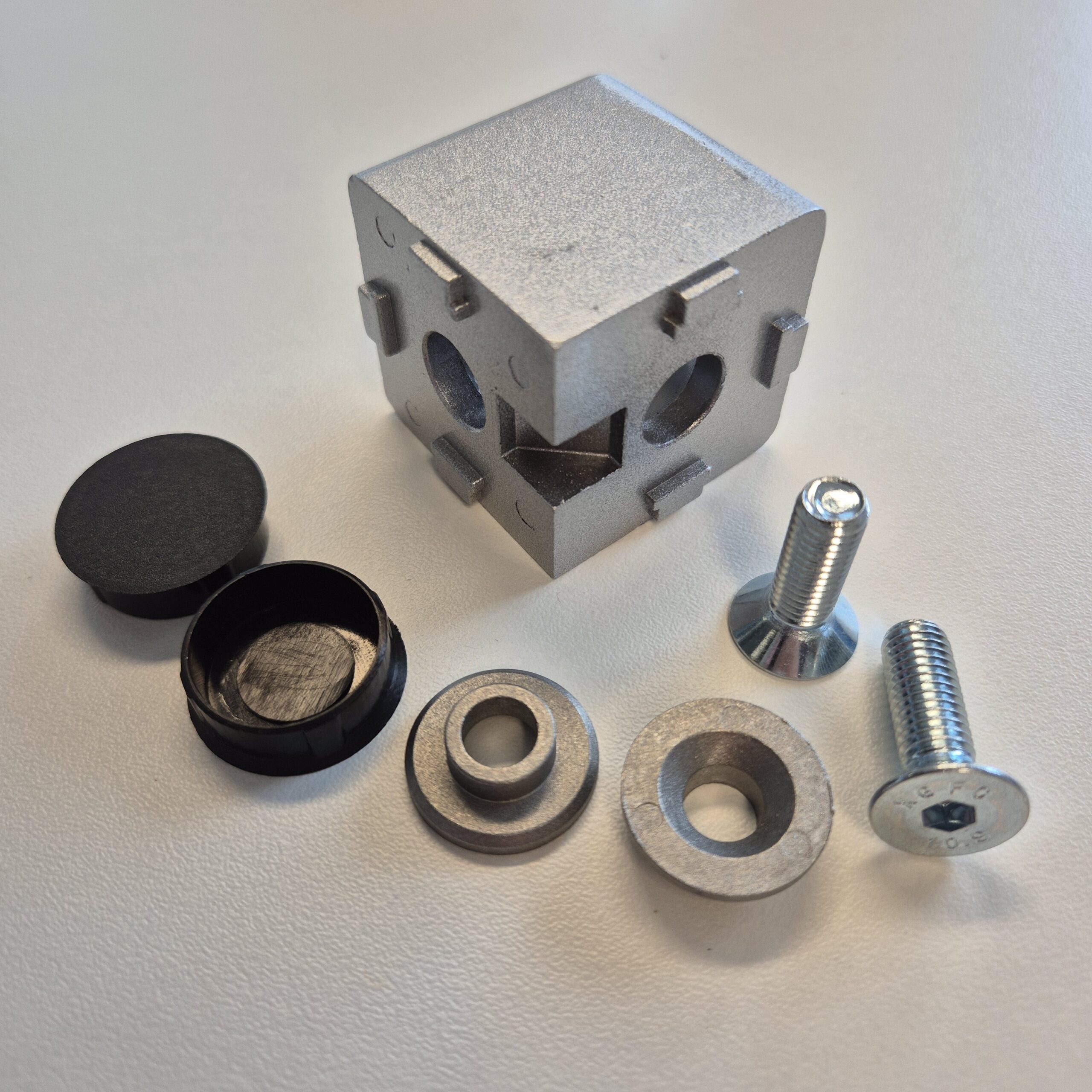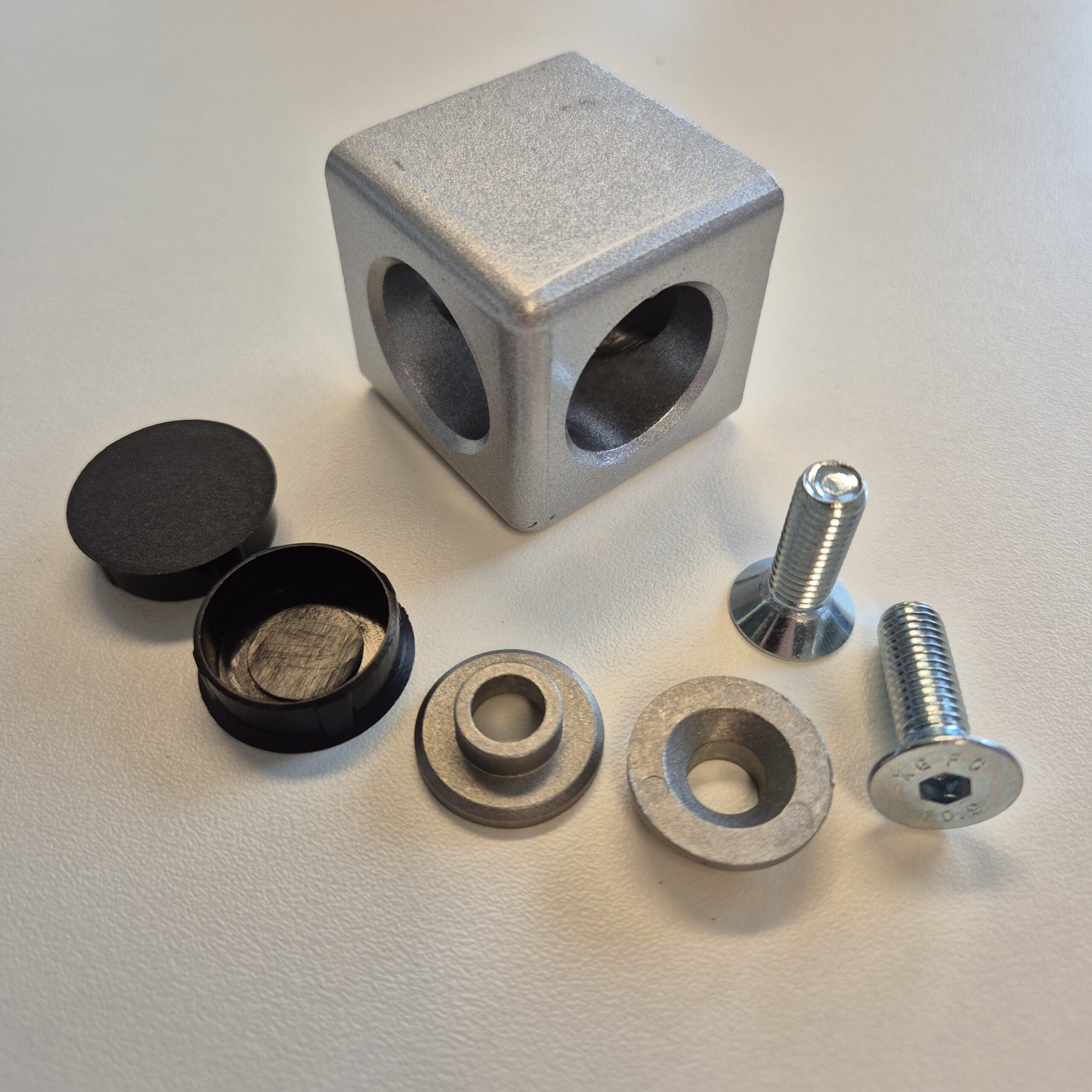 Der Würfelverbinder verfügt über eine Anbindung an zwei Flächen. Somit lassen sich Verbindungen schnell über ein Gewinde herstellen, welches in die Zentralbohrung des Profils eingebracht wird. Eine Freistellung in den Ecke des Würfelverbinders lässt das Einlegen von Flächenelementen zu.